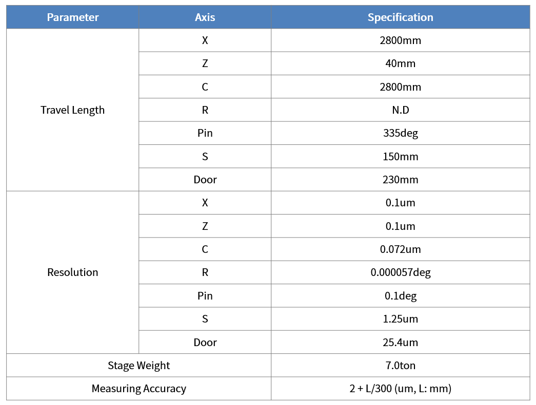 設(shè)備參數(shù) ?- 可測(cè)量螺桿長(zhǎng)度 : 500~2800mm - ?激光尺寸誤差 : 1ppm ?- 測(cè)量精度 : 2 + L/300 (um, L : mm) ?- 根據(jù)客戶要求定制